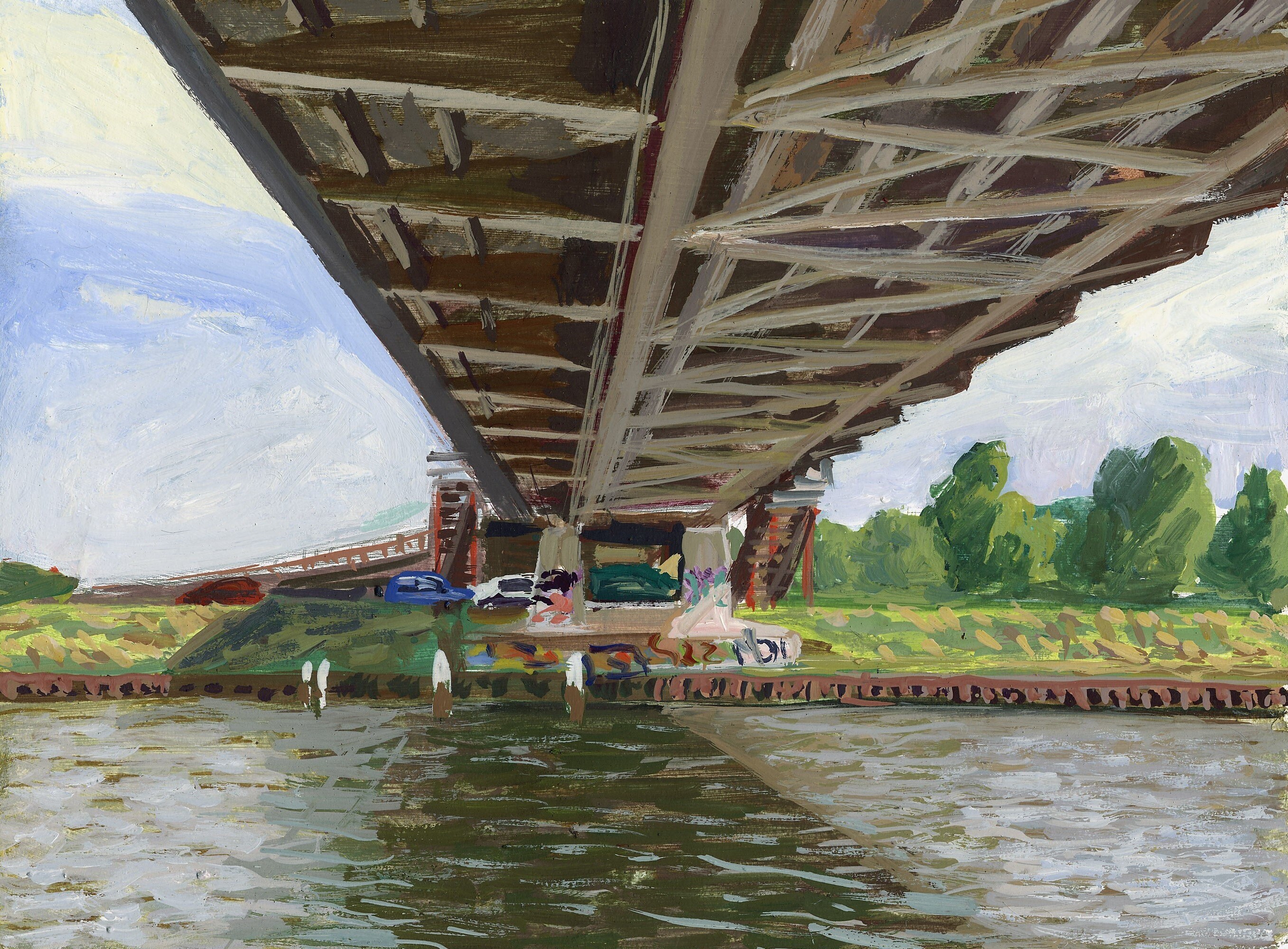 Bruggen verbeelden de overwinning van het land op het scheidende water. Ze zijn van veel kanten te benaderen, zowel fysiek als picturaal, en daardoor ook een geliefd motief in de beeldende kunst. De brug is een paradox in zichzelf: hij verbindt, maar als hij open is sluit hij juist af. De drie kunstenaars in dit thema benaderen elk op hun eigen manier de brug als picturale uitdaging.