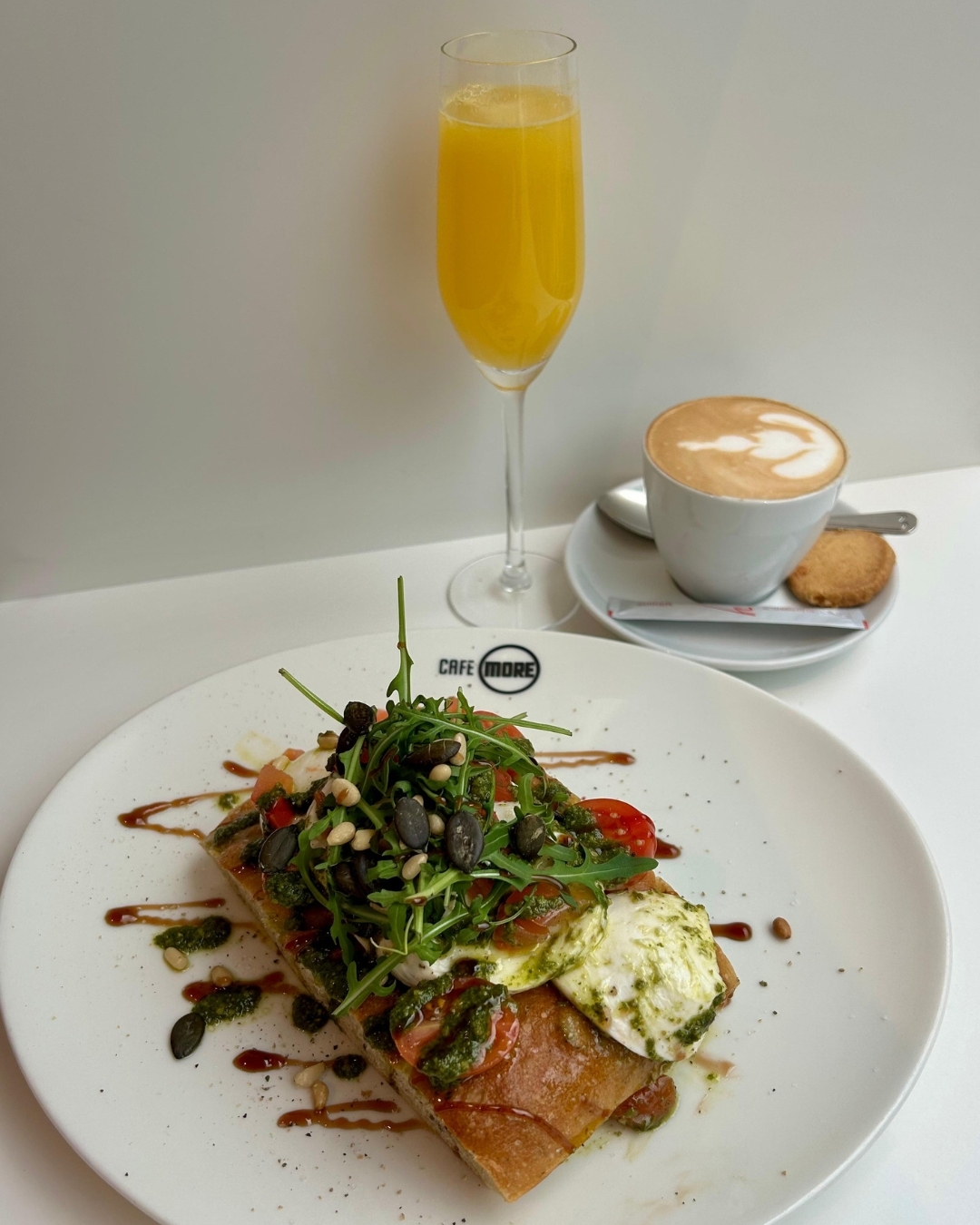 Begin je dag goed met een Italiaans geïnspireerd ontbijt: verse focaccia met mozzarella, tomaat en pesto, een alcoholvrije mimosa en koffie of thee.