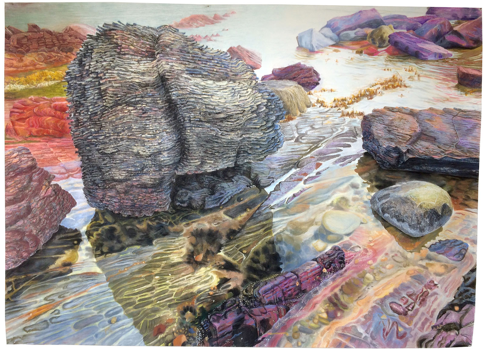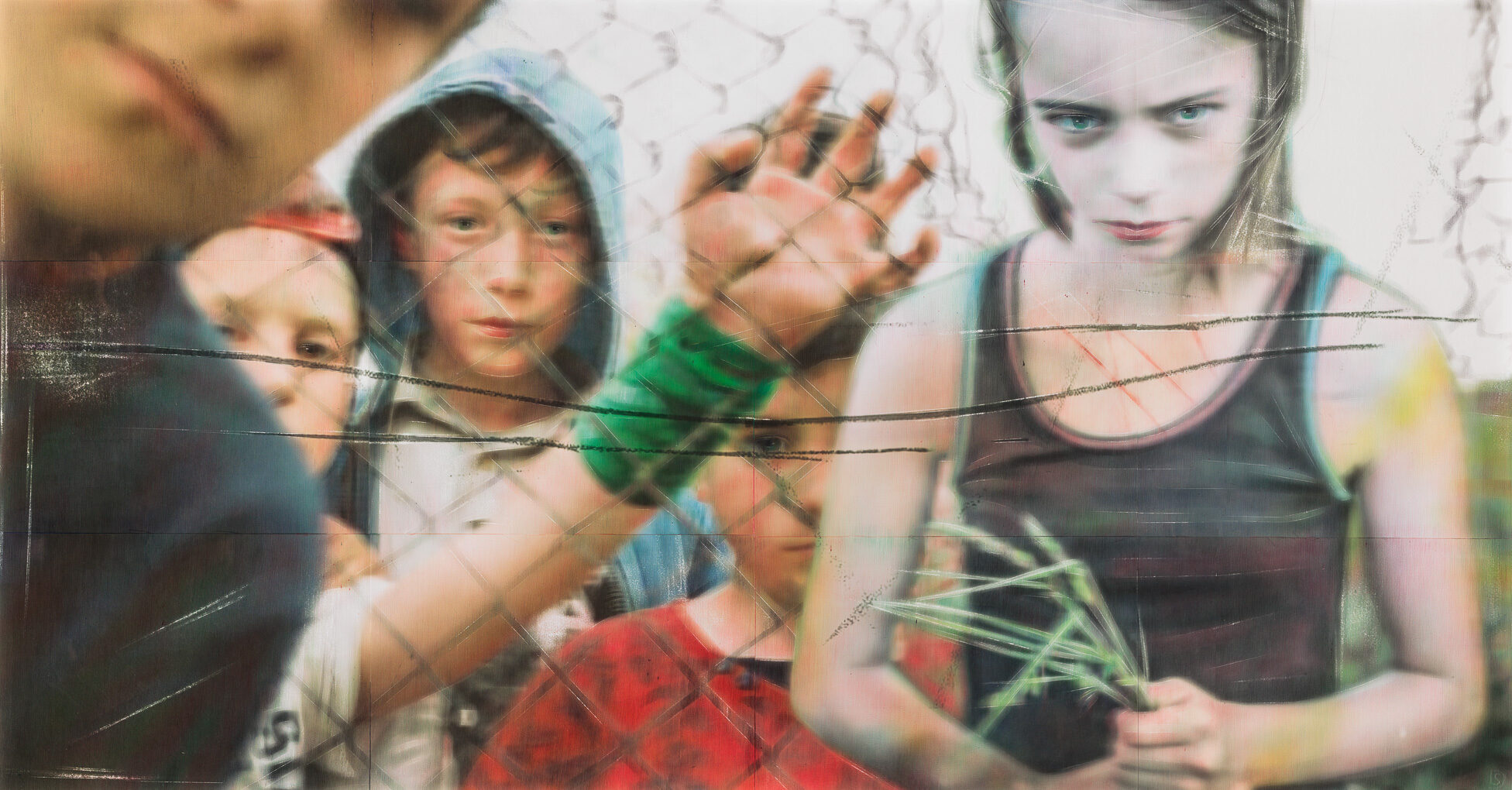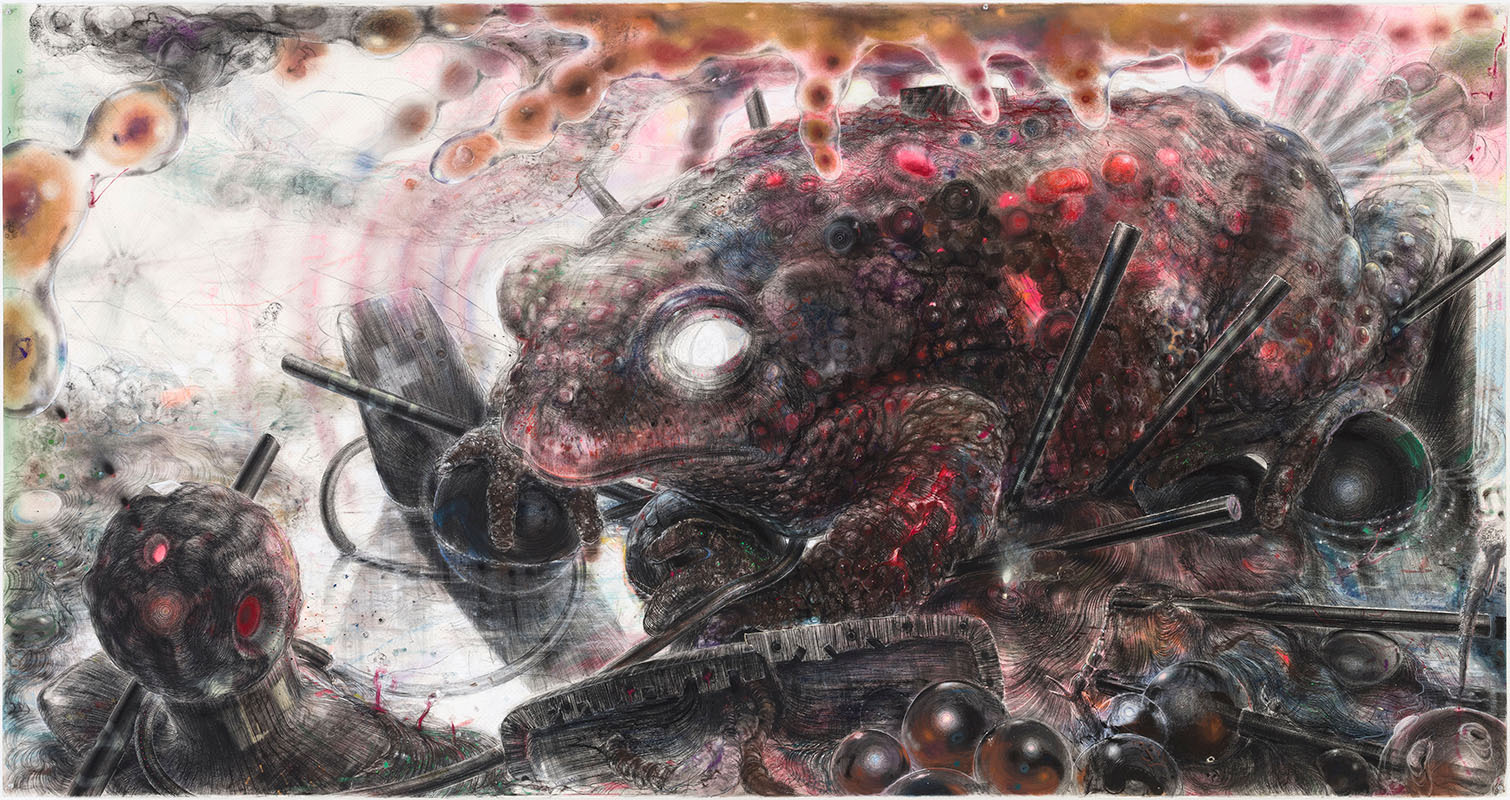 But it’s not just about sheer ‘wall power’. While the intense physical presence of a larger-than-human artwork can be overwhelming, the exhibition also highlights the variety of the subject matter explored by the artists, from immersive natural landscapes to disorienting virtual or dystopian realities. From critical visions of current issues, such as war, ecocide, power and propaganda, to the idiosyncratic nature of personal memories and universal human emotions. Themes that benefit from a substantial scale. Something that can impress without intimidating. That can cause our surroundings to disappear for a moment. We are drawn in closer and closer, embraced, and invited to discover all the secrets. This is drawing to lose yourself in.